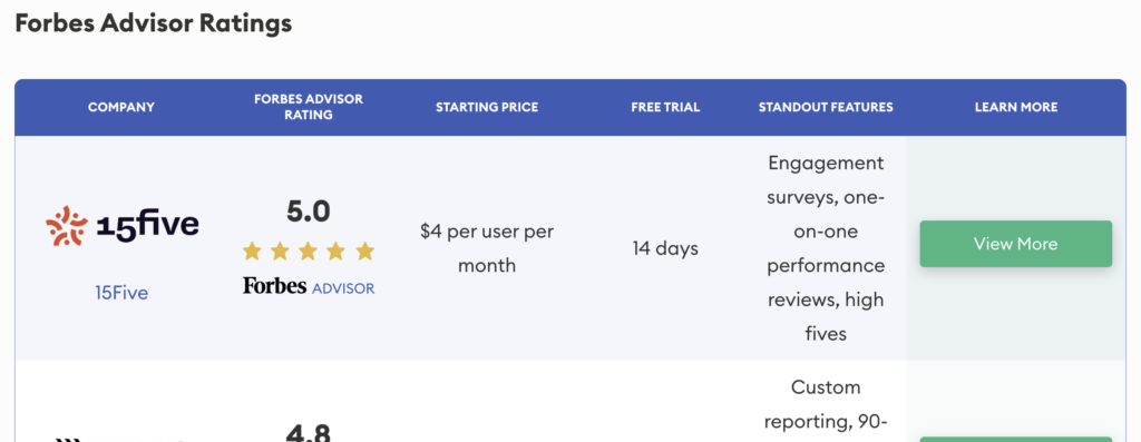 We are proud to share that Forbes ranked 15Five as Best Overall Talent Management Software for 2023! They are providing this analysis for HR teams to choose the right solution for their businesses to "achieve a productive, high-performing workforce."