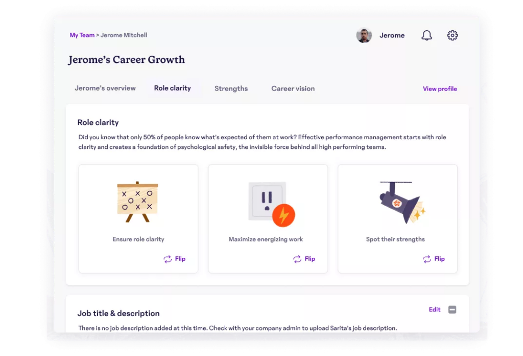 As your business changes and evolves so do your employees’ jobs, so it’s critical for managers and employees to have regular conversations around expectations and be flexible to make adjustments as needed. This gives employees the opportunity to speak up if there’s an area of their role they’re unclear about or a new challenge they’d like to take on. This open dialogue not only helps with role clarity but also strengthens the employee-manager relationship, and can lead to a greater sense of purpose for employees. (Purpose and the manager relationship are also engagement drivers—so it’s a win-win … win!)