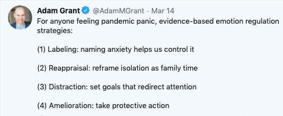 Adam Grant along with Brene Brown, a research professor at the University of Houston, promote the following emotion-regulation strategies as people around the globe are feeling the impact of COVID-19.