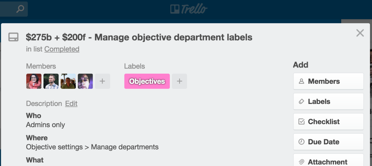 Of course, nobody is tied to these quotes. Holding people to their quotes seems too strict for the goal at hand; create estimates that help guide decision making. And come on, we’re engineers, not lawyers. (No offense to any lawyers who represent or will represent 15Five (“Company”) or its employees (“Employees”) now or at any point in the future.) What is useful, is to have a debrief at the end of every sprint to discuss how close we came to these estimates. Engineering leads should be doing this anyway, if for no other reason than to increase accountability and efficiency on the team. The added bonus is that as the team become more accurate with these estimates, stakeholders from other teams will be able to communicate expectations about the product roadmap to customers and other employees. So how has this strategy helped us? 1) It helps us make decisions about what is a priority. 2) When loading on work for a sprint, a developer can have a sense of how much work they can accomplish in a sprint and only pull in say $2000 worth of tickets for that sprint. 3) Finally, we can calculate how much work got done in the past sprint and give leadership and our investors an idea of our velocity; how much dev is putting out each week/month/quarter. Sprinkle in a little regex parsing of the title (magic geek speak for looking for a word or two like “bug” or “fix” in the title) to determine if the ticket is a feature or a bug. Now you have a comparison of how much time you’re devoting to each category. In March of 2016, we unveiled our Plus and Pro plans along with a suite of new features including metrics questions and visual dashboards. In Q4 we released a complex new feature called Objectives (OKRs). Releasing so many new features and product changes over a short span of time was one of the most ambitious engineering projects we have ever attempted. We could not have completed them without an efficient system to estimate and prioritize our software development efforts. At the end of the day (or sprint cycle), attributing dollar amounts to projects is a nice little hack that lets us prioritize what gets done, what doesn’t, and by when. This process keeps cross-team functionality high, relationships healthy, and our customers happy. Unless of course they want to put a digital fidget spinner in the middle of the UI. That’s where I draw the line.