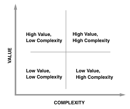 This approach is desirable in terms of its simplicity. If a task is highly complex and has low business value, it should be avoided. If it is not very complex and has high value, it moves to the top of the queue. But there is an enormous grey area here. For example,