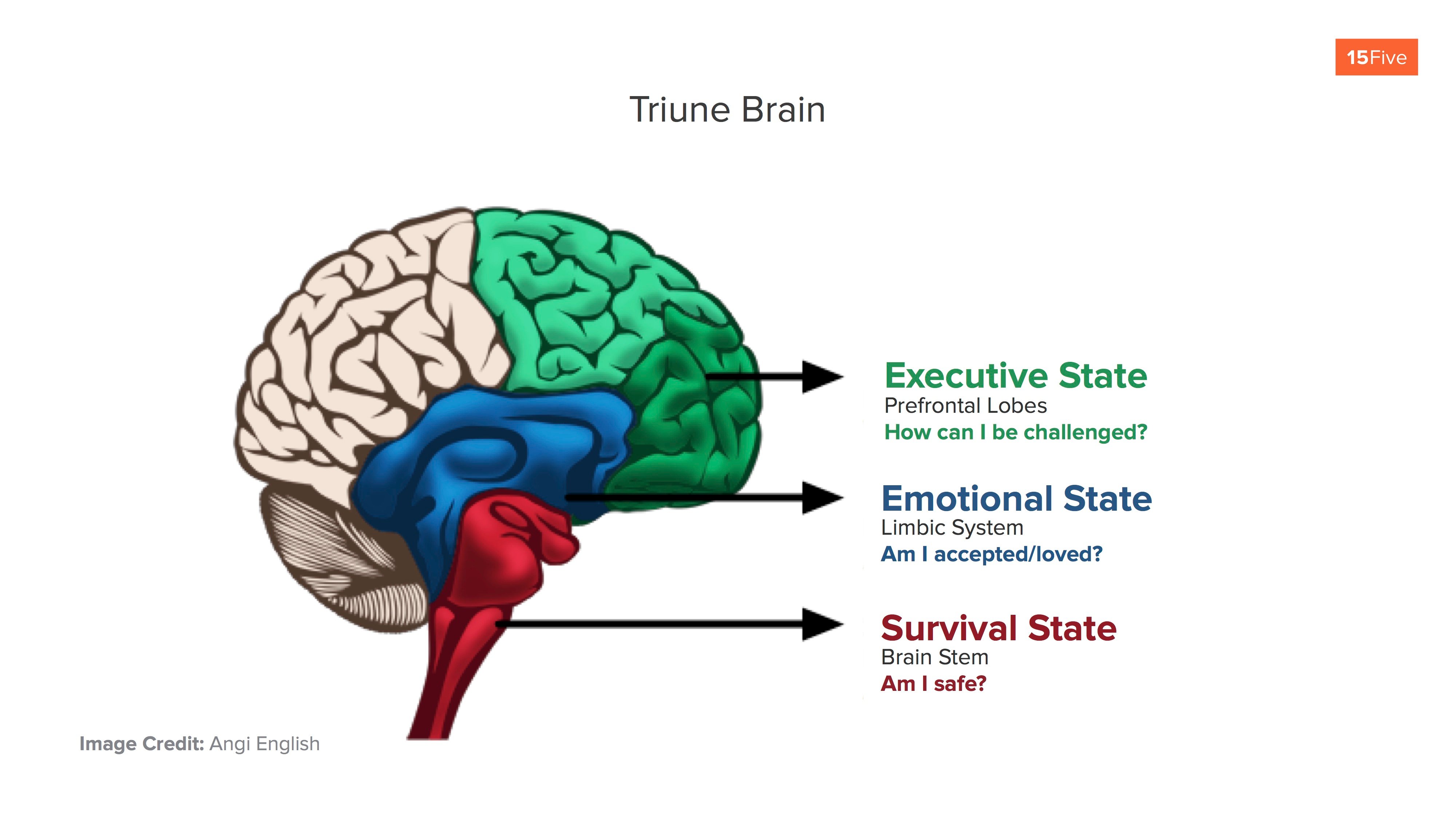 The rungs on Maslow’s pyramid managers need to be mostly concerned with are Safety, Belonging, and Esteem. Unfortunately most organizations inadvertently create a feeling of threat and insecurity for their people where they don’t feel safe or they don’t feel they belong. Why this matters is because this maps to exactly the way our brains function.