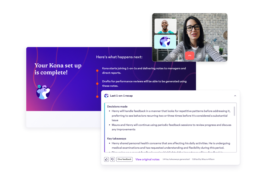 The only meeting assistant designed to preserve psychologically safe 1:1s. All participants can pause Kona's notetaking at any time and receive a copy of meeting notes.