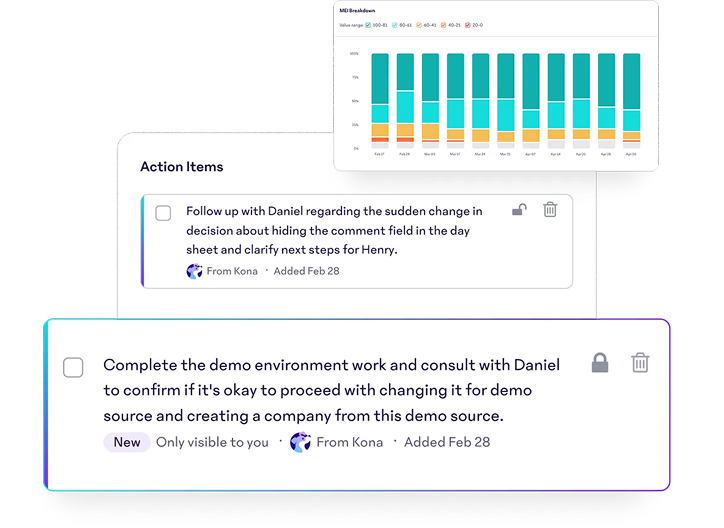 Put proof points on auto pilot, Kona translates action items, wins and challenges from conversations in 15five and tracks behavior reports over time