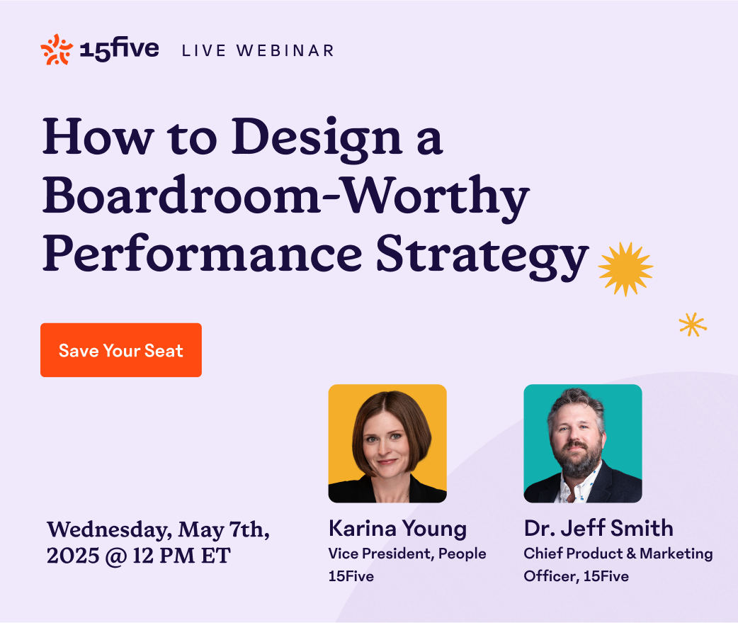 This live workshop with 15Five's Karina Young and Jeff Smith will show you how to design a performance strategy that holds up in the boardroom and drives outcomes across your organization. Together, we'll walk through how to align your people programs with company priorities, surface the right data, and present a roadmap that earns buy-in and accelerates impact.